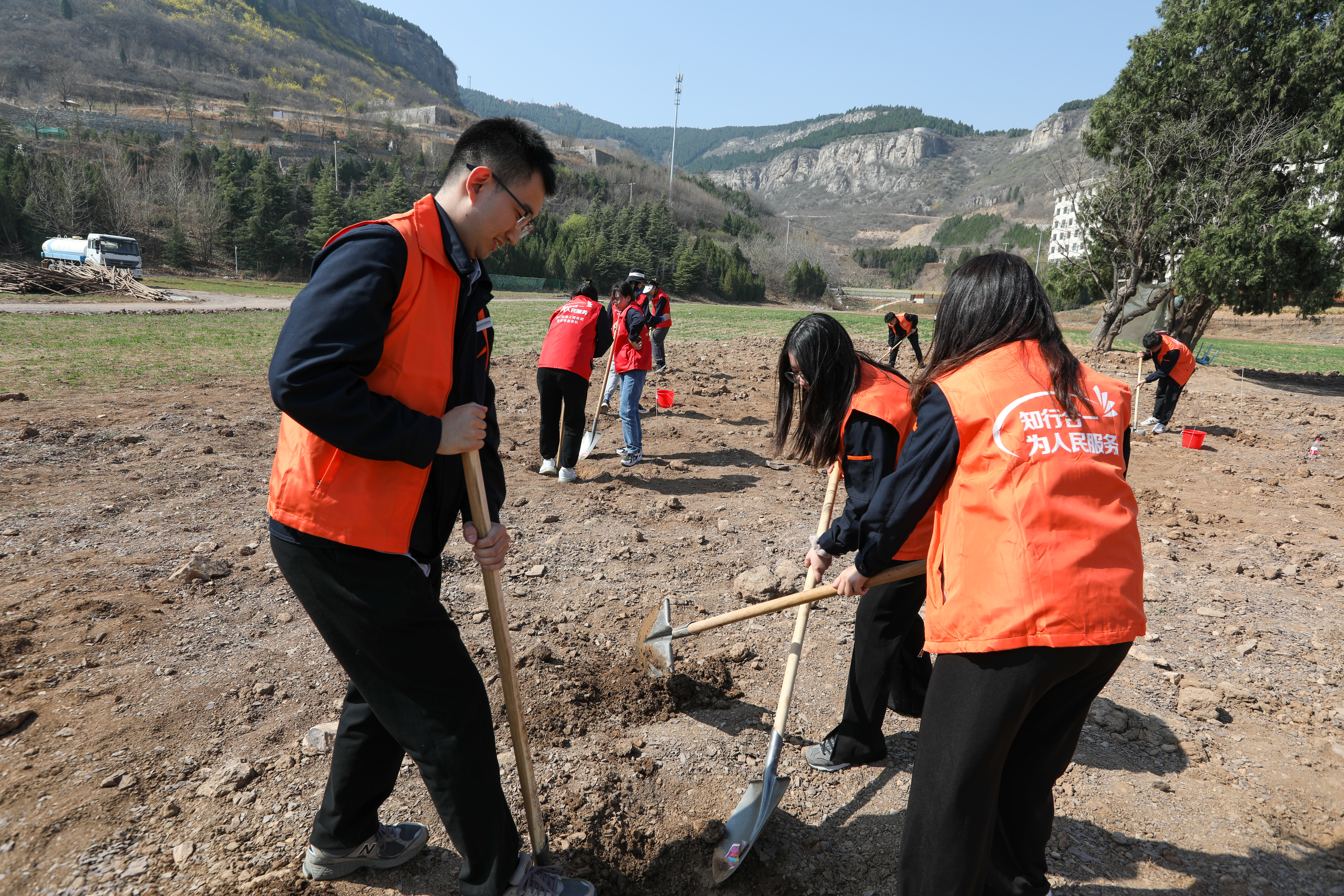 时至正午,这场植树活动也已接近尾声。在和煦的阳光下,一株株树苗迎风而立,为寂静的山谷又添了一抹春天的气息。