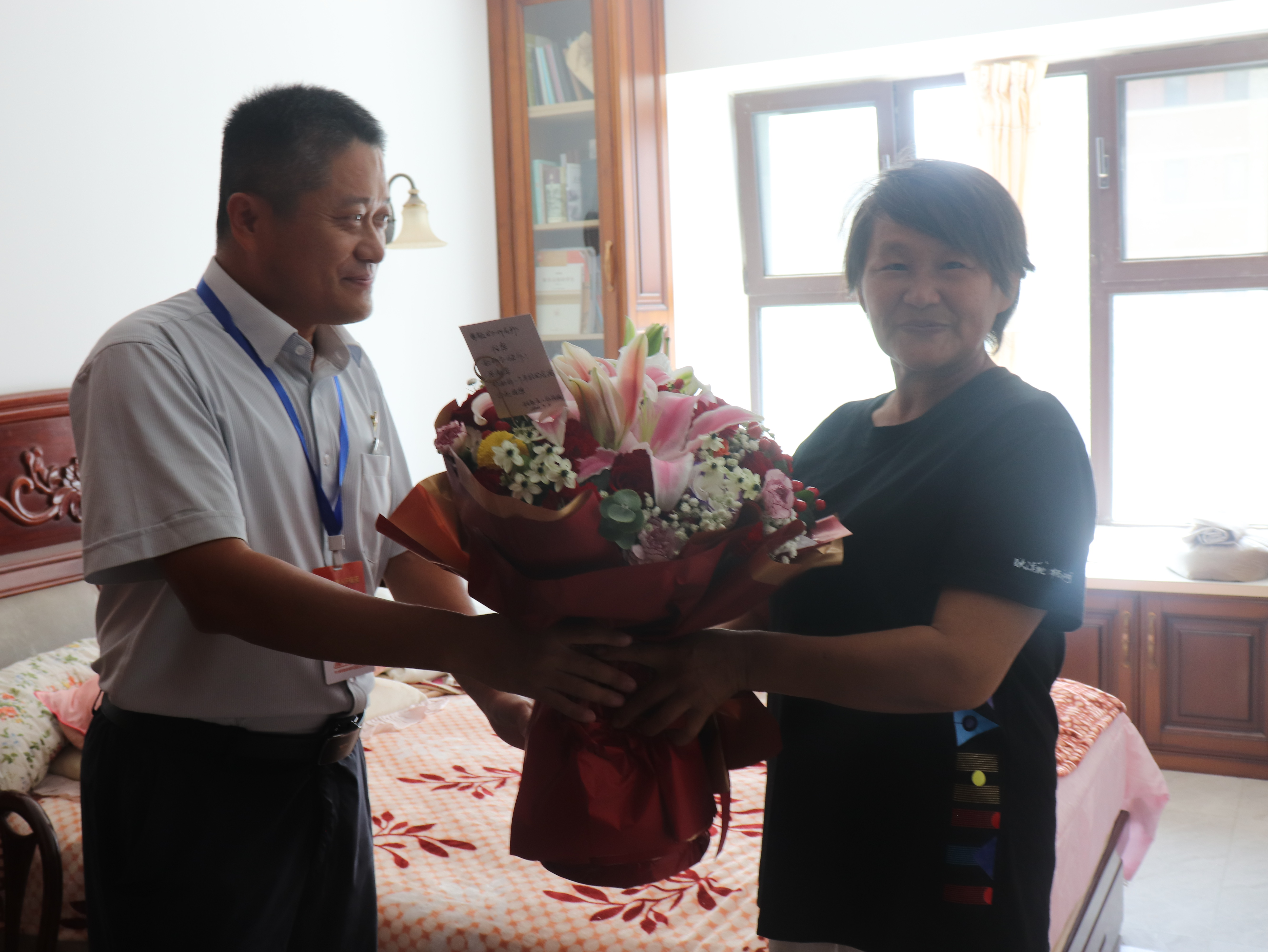 9月8日,在公司所辖供暖区域济南市槐荫区蓝石大溪地社区,德和公司工作人员王炳超和中心站站长韩吉玺一起看望慰问退休人民教师乔老师,并为其送上鲜花,祝乔老师节日快乐;同时,工作人员还为老人送来了鸡蛋、牛奶等生活用品,场面温馨又暖心。