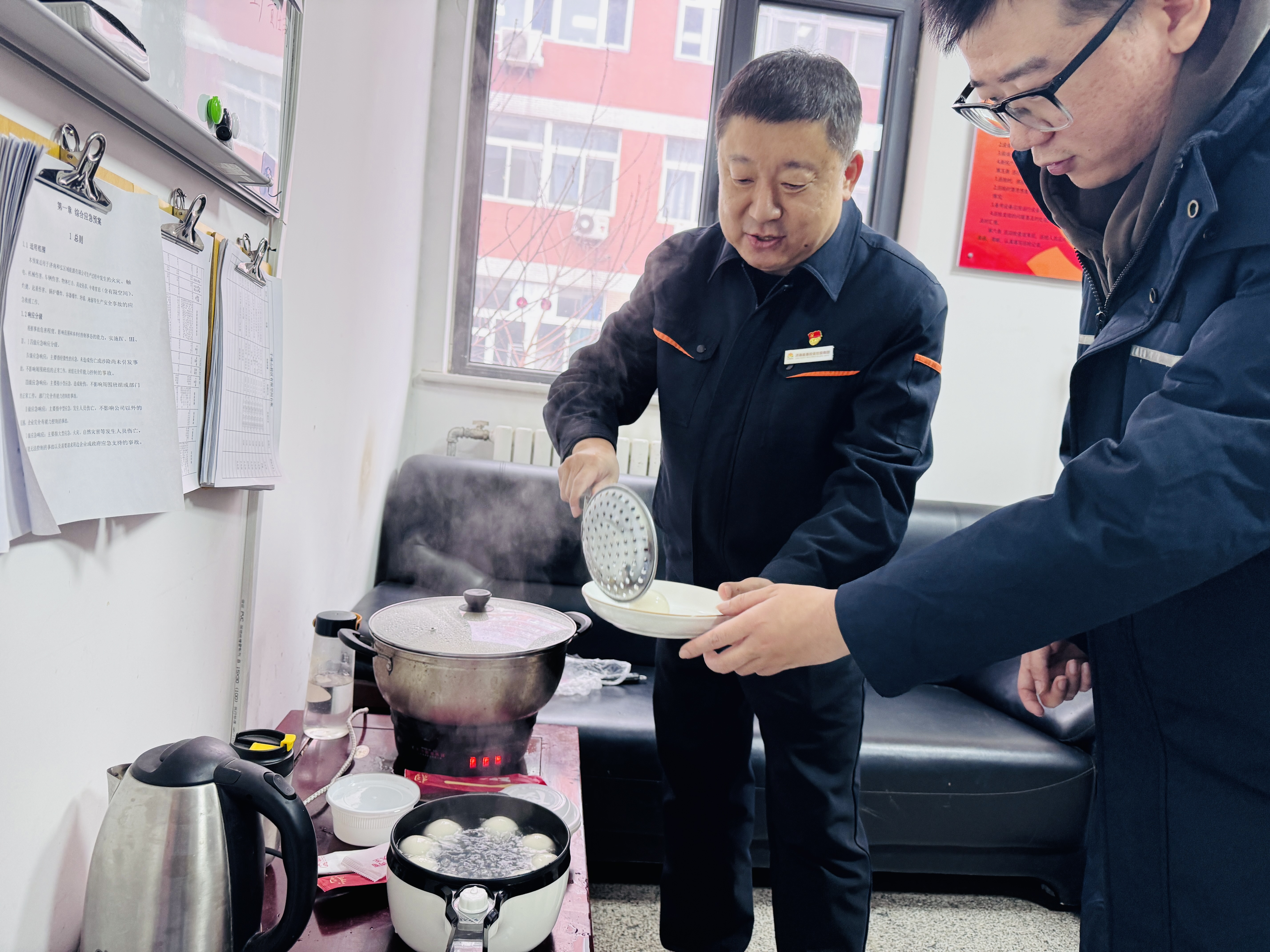 为了让一线职工感受到节日的氛围和温暖,领导带队深入一线,开展关怀慰问活动。在千佛山校区换热站,大家围坐在一起,一边吃着热乎乎的元宵,一边聊着工作、唠着家常,欢声笑语不断。平日里满是设备轰鸣的换热站,此刻也多了几分温馨的节日气息。